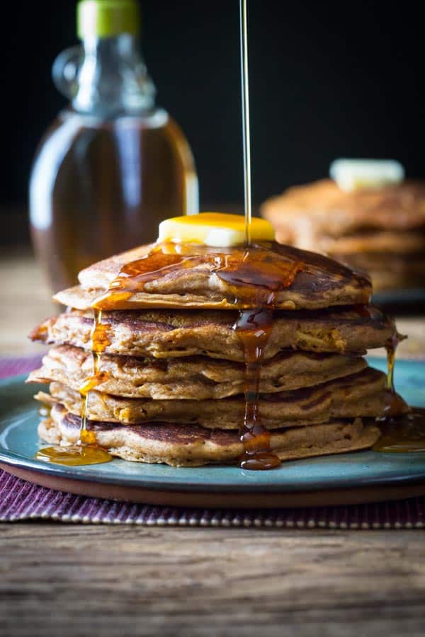 Whole-grain Gingerbread apple pancakes from Healthy Seasonal Pancakes for the holiday season. Perfect for when you have house guests or any leisurely Saturday or Sunday morning. They are plate-licking good.