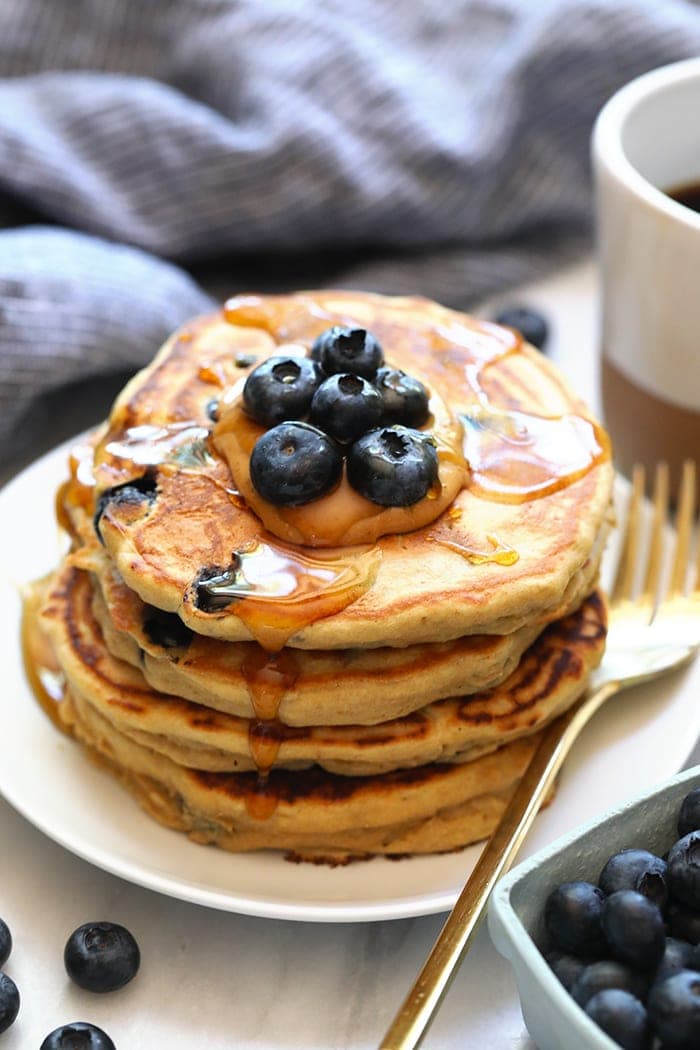 This easy blueberry protein pancakes recipe from Fit Foodie Finds is made with 100% whole grains, your favorite protein powder, mashed banana, and blueberries! You’ll never use another protein powder pancakes recipe again.