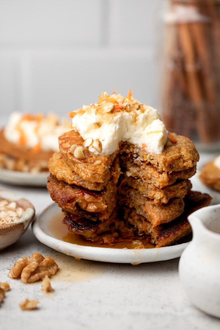 These Healthy Carrot Cake Pancakes from All The Healthy Things have all the delicious flavor of carrot cake in the form of a fluffy and easy to make pancake! They’re made with a few simple real food ingredients like, fresh carrots and oatmeal, and come together right in the blender. These delicious pancakes are perfect for a quick, healthy, and filling breakfast that everyone will enjoy!