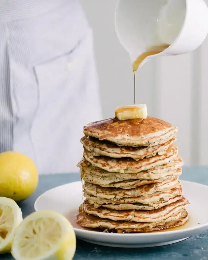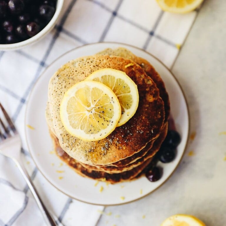 Spring into action with these Healthy Lemon Poppyseed Pancakes! A pancake recipe made with wholesome ingredients including oat flour, poppyseeds and maple syrup that will make you feel great about your next brunch.