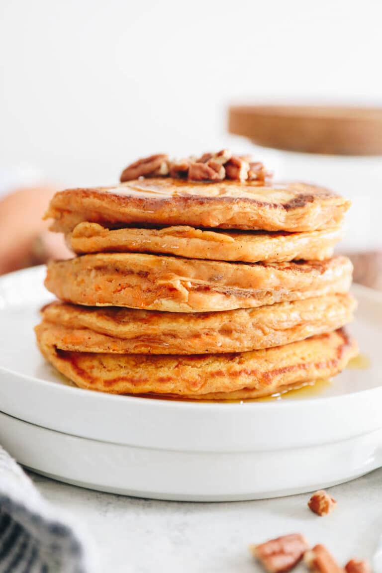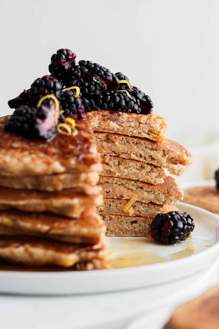 Store leftover pancakes in an airtight container in the fridge for up to 5 days or in the freezer for longer. To freeze pancakes you’ll lay them in a single layer on a baking sheet and freeze for 1 hour. Then place them into a ziplock bag and freeze for up to 3 months. When you’re ready to enjoy, pop them in a toaster or microwave to reheat.