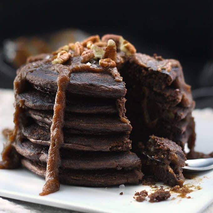 These delicious hot chocolate pancakes are fluffy like classic pancakes and topped with my deceptively milk-free salted dulce de leche.