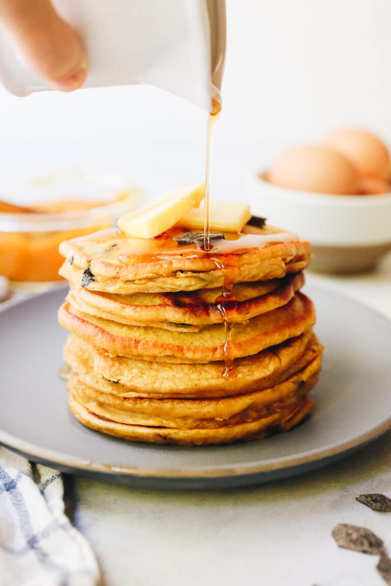 Add some spice to your regular ole’ breakfasts with these Pumpkin Chocolate Chip Pancakes. They’re made with real pumpkin and sweetened with just a touch of maple syrup. You will fall head over heels for these fluffy and spicy and pancakes!