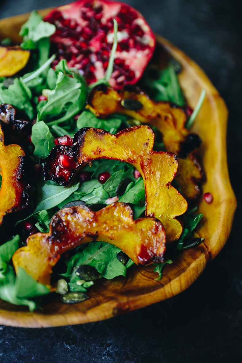 The ultimate fall salad is this maple roasted acorn squash salad tossed with a deliciously decadent pomegranate vinaigrette. The perfect way to get in your seasonal veggies!