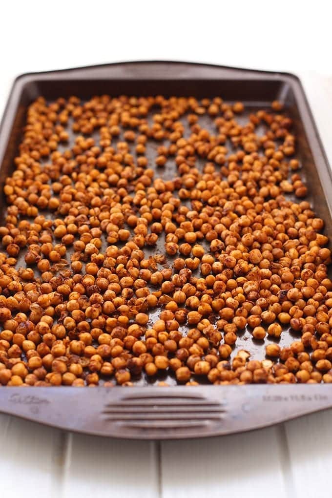 - Spread out on a baking sheet and bake for 20-25 mins (at 400) or until chickpeas are browned and crispy.