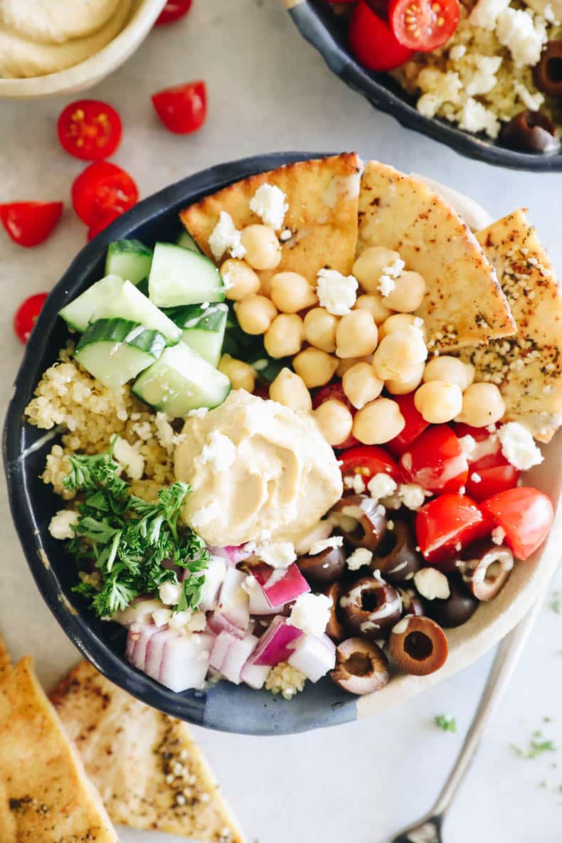 - Top each bowl with cherry tomatoes, cucumber, red onion, olives, fresh parsley, pita chips, feta cheese and a scoop of hummus.