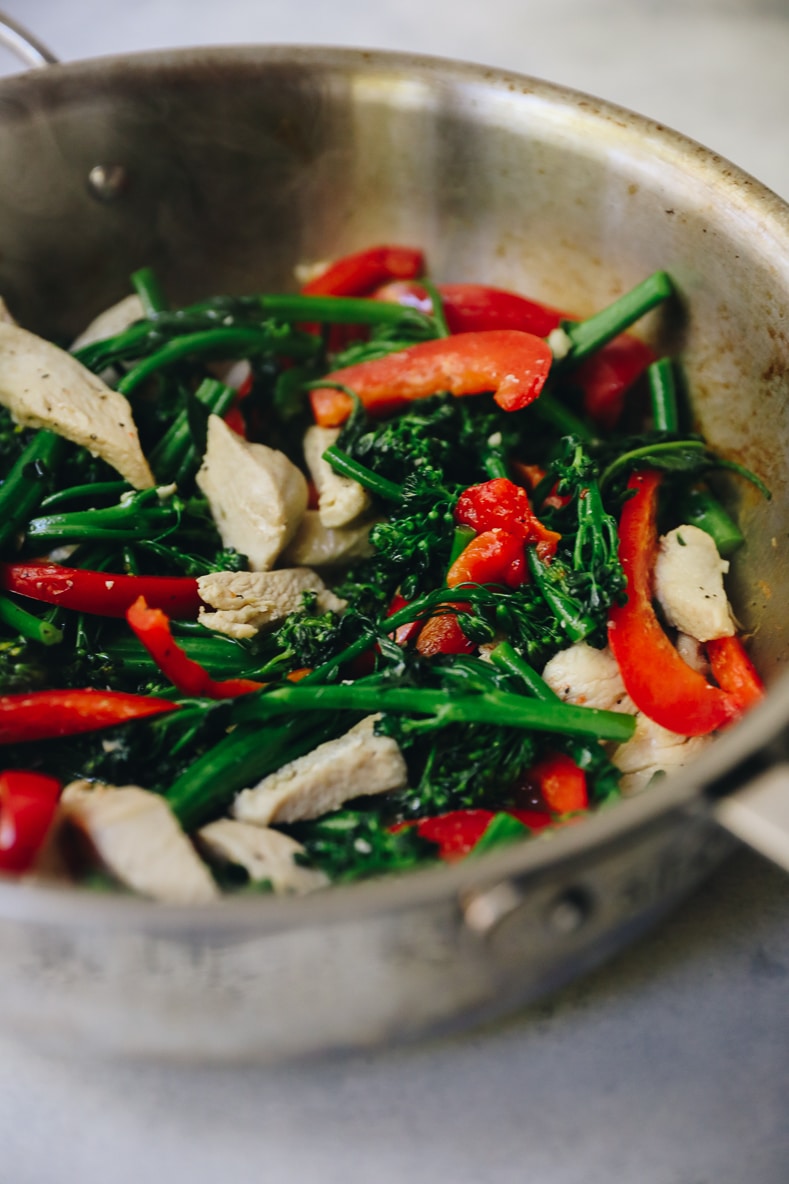 - Add in your remaining garlic, baby broccoli, bell pepper and jalapeno and stir to combine well with chicken. Place a top on your pot or wok and let veggies steam for 2 minutes.