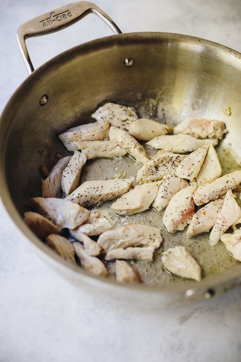 STEP 2: While noodles are cooking add sesame oil to a large pot or wok and heat over medium heat. Add 1 garlic clove and quickly stir fry for 30 seconds. Add your chicken, sprinkle with salt + pepper and flip occasionally until all sides have turned from pink to white (1-2 minutes).
