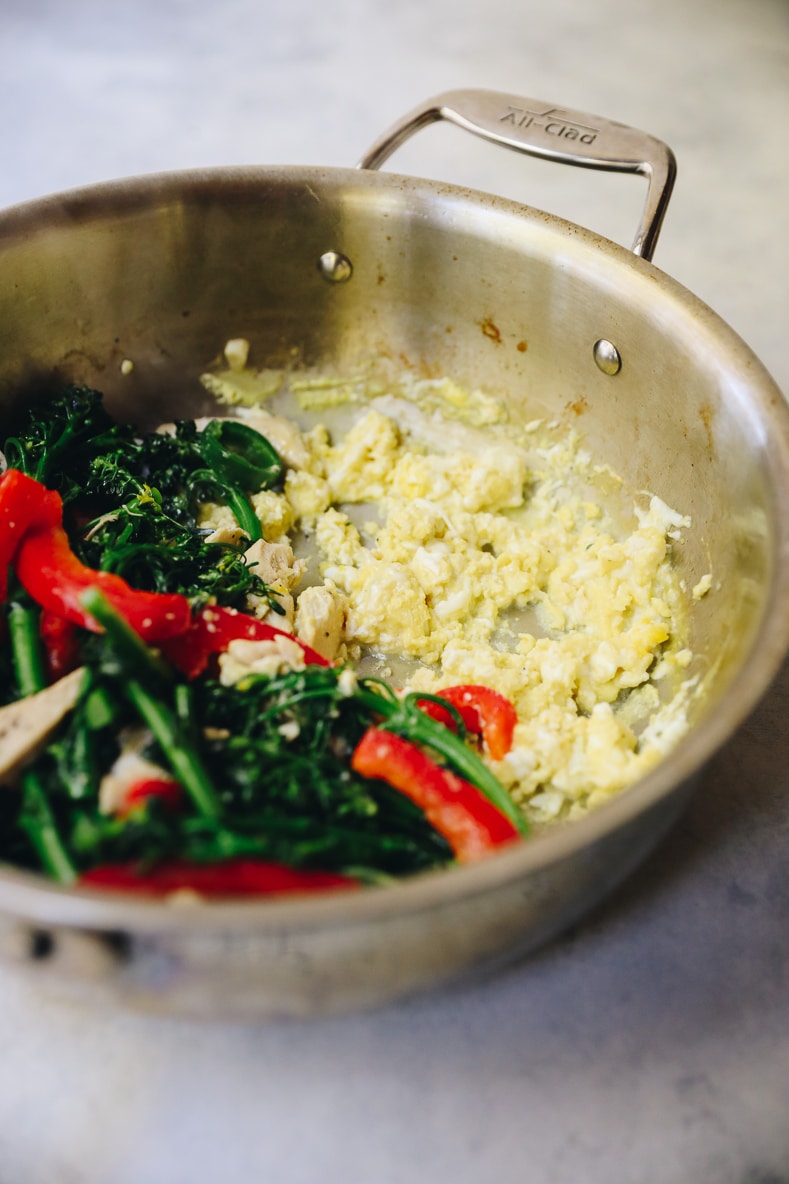 - Push veggies and chicken to one side of pot or wok and crack eggs directly into the wok. Scramble immediately using a spatula. Once cooked combine with veggies and chicken.