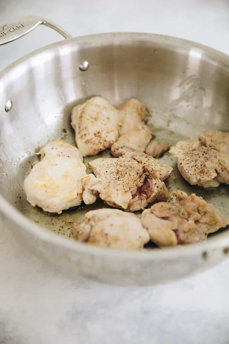 - Add your chicken thighs and sprinkle with salt and pepper. Brown on both sides for approx 3-5 minutes.