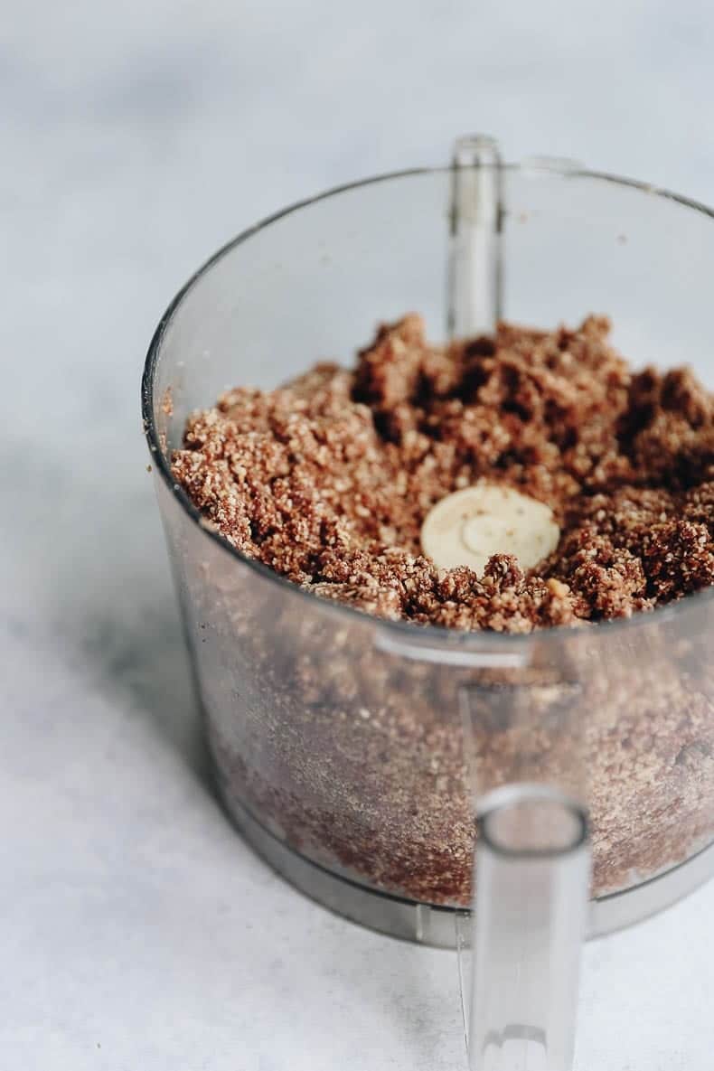STEP 2: Pulse the hazelnuts and oats in a food processor until they are in small pieces. Add in the dates, cacao powder, vanilla and salt and pulse until combined. If the mixture seems too dry, you can add water 1 tablespoon at a time.