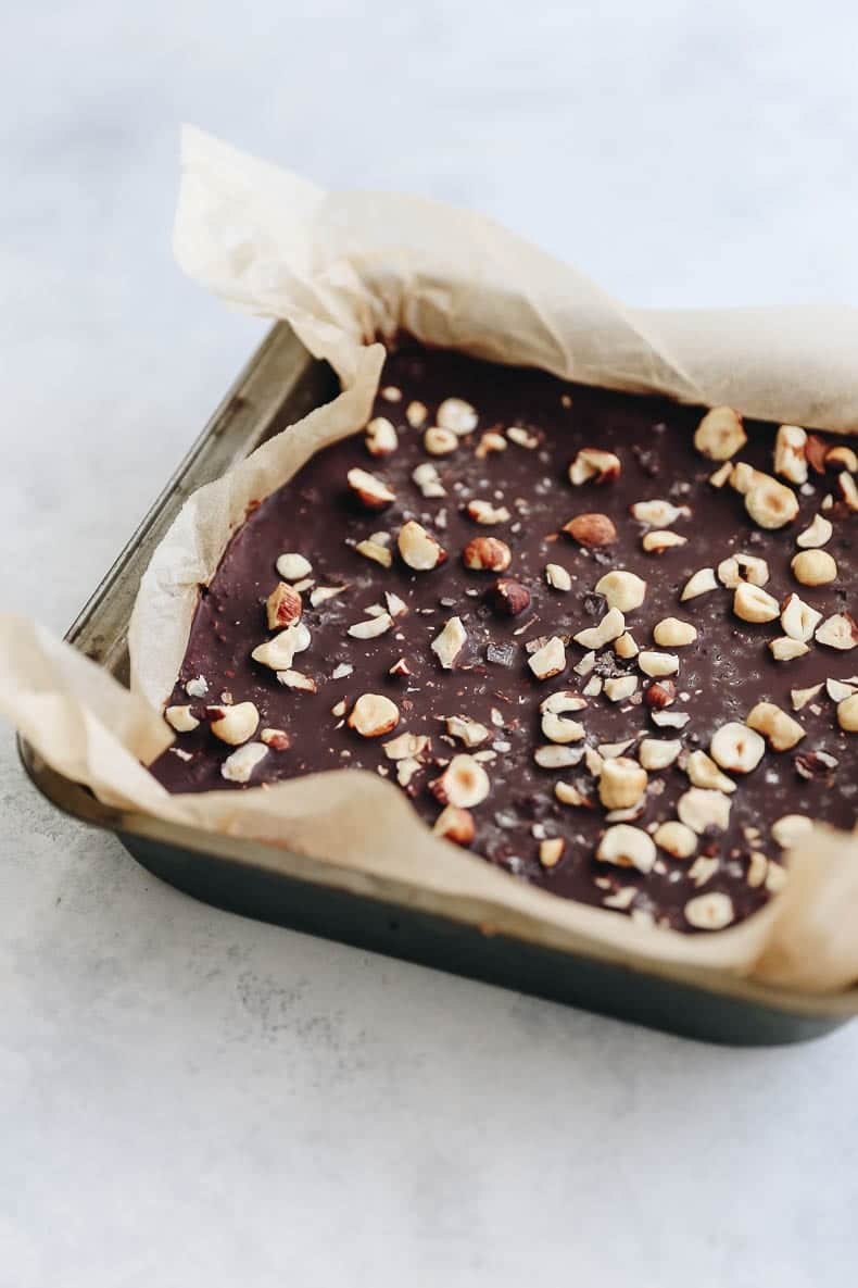 - Pour the chocolate mixture over the base and top with the chopped hazelnuts and flaked sea salt.