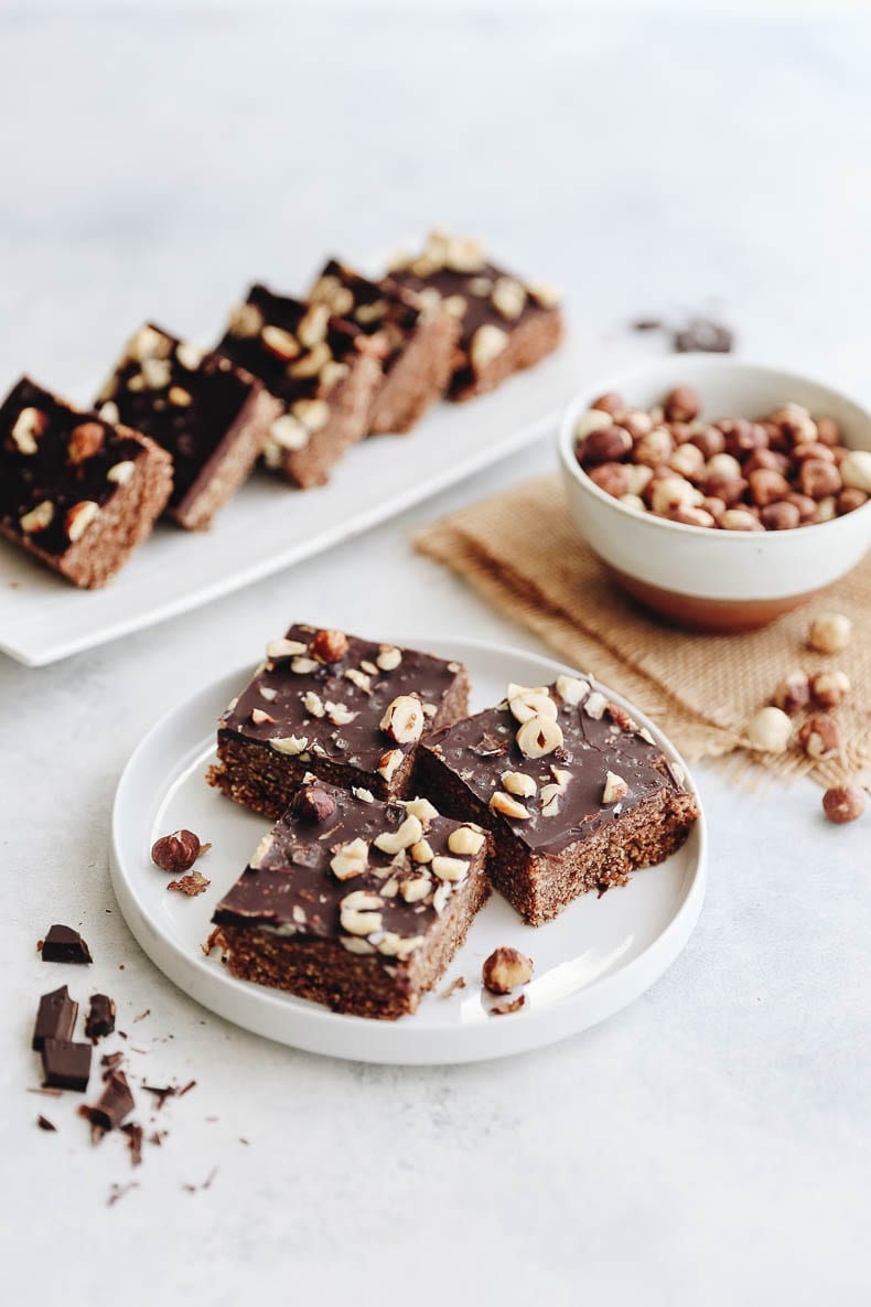 These Raw Nutella Bars are a quick, easy-to-make snacks made with just 6 healthy ingredients – no actual nutella necessary! With a hazelnut and date-base and a simple chocolate coating, these bars will totally hit the spot.