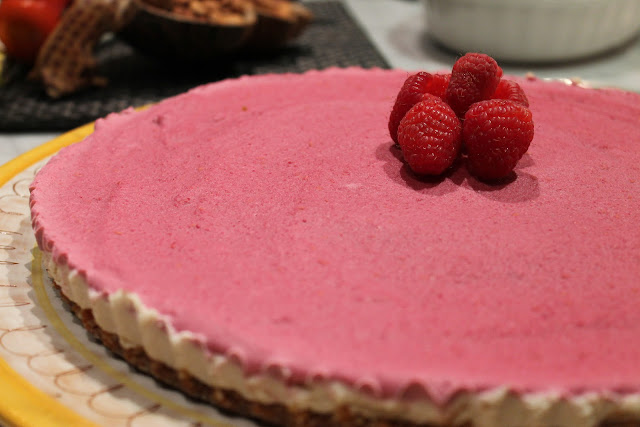 - In the food processor place all filling ingredients (except raspberries) and blend on high until very smooth (about 5 minutes). Scrape down sides as needed