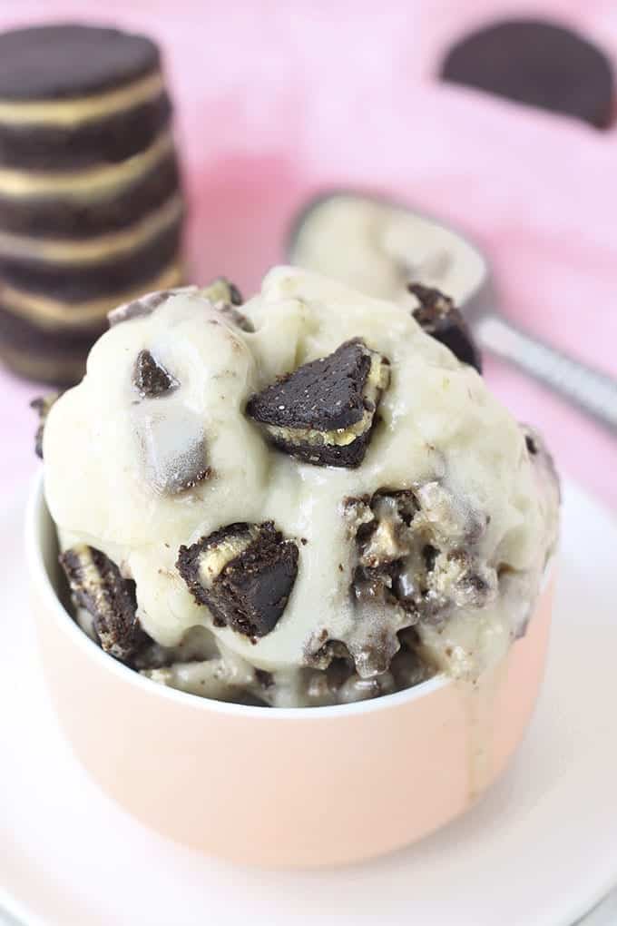 You can enjoy banana ice cream on it’s own or you can mix in countless flavors to take this frozen dessert to the next level. I am an Oreo lover so naturally I made a healthy version and mixed them into banana ice cream for my version of cookies and cream ice cream. Simply chop up the cookies and mix into the ice cream after the bananas have been blended together.