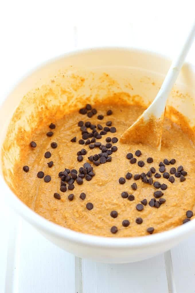 STEP 3: Add the wet ingredients to the dry ingredients and stir to combine. Stir in the chocolate chips. If your batter is too thick at this point, you can add a little bit more almond milk.