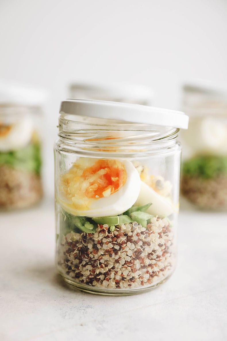 - To assemble the jars, place ⅓ cup quinoa in the bottom of the jar. Next add ¼ cup sliced snap peas. Place one of the eggs, cut in half, on top and spoon a few spoonfuls of the sauce over everything. Store in the fridge and eat over the next 4-5 days.